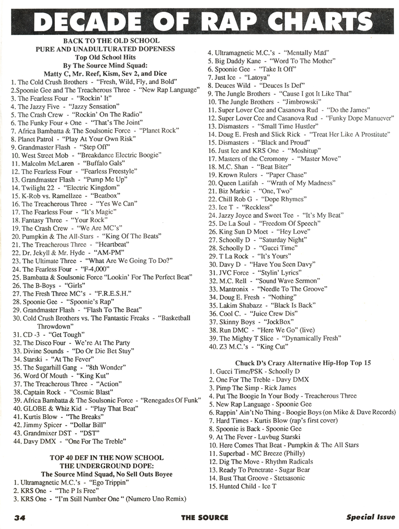This brings back some memories… these charts went in! Chuck D‘s ‘Crazy Alternative Top Hip-Hop 15’ is a winner, as are the contributions from Harry Allen, J. The Sultan and Funken-Klein (R.I.P.). Considering how young I was when this issue dropped, there were a lot of records that I sought-out on the strength of their inclusion on these lists.