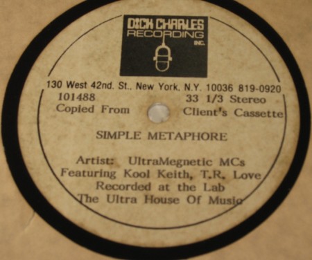 Think there isn’t much money in selling old rap records these days? You’re just doing it wrong – Ultramagnetic MC’s acetates are the future! ‘CHILLING w/ Chuck Chill out’ by Ocean Ultra Magnetic went for over $2,800 in 2010, despite the fact that a bootleg taken off a tape recording of Chuck’s KISS FM show was also released on 10″. This past September, another Dick Charles Recordings acetate appeared, this time fetching just over $3,200! Labeled as ‘Simple Metaphore’ by Ultramegnetic MC’s feat. Kool Keith, T.R. Love and with ‘MC’s Ultra – Remix’ on the b-side.