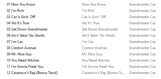 Back before rap magazines and the internet, I heard a rumor that Grandmaster Caz and Ced-Gee were working on an album together. Needless to say, my young mind was blown at the possibility of these two rap geniuses teaming-up. While we only got a couple of Tuff City singles from this meeting of minds, it turns out that they did in fact record an entire album of material together in 1992 before Aaron Fuch‘s decided that the material ‘wasn’t commercial enough,’ according to a piece that Dave Tompkins did on the ‘You Need Stitches’ single. Tuff City eventually released the vaulted material on a couple of compilations, so I thought I’d assemble it all together to paint a picture of how Caz’s 1992 LP, The Grandest Of Them All was originally intended to sound before The Mighty Maestro was recruited to remake it. ‘I’m Gonna Freak You’ deserves a special mention as being one of the most amusing sex raps ever recorded, while ‘I’m Rich’ is flossing at it’s finest. I’ve also included the earlier records they did together, just on the general principle that everything Ced touched during that period was amazing and Caz still had some gas in the tank despite being part of the old guard by this point. Bronx brilliance at it’s finest, albeit in poorly mixed, unpolished form.