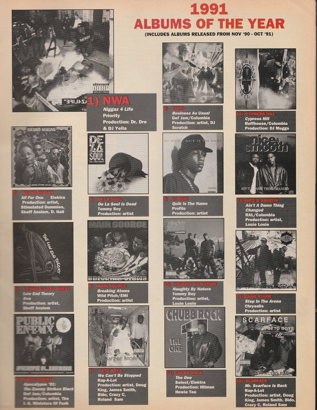 Might be worth doing proper versions of these, year-by-year, without the November to October restriction. WC and The MADD Circle, Ice-T and KMD need to be included at the very least.